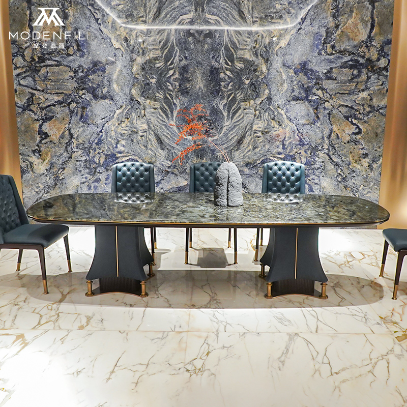 The MODENFILI SM001 dining table is a statement piece that brings elegance and luxury to any dining room. Featuring a stunning marble top with a unique veining pattern, this table is crafted for those who appreciate fine design and quality. The table is supported by a robust, dark wood base with gold accents, adding a touch of opulence. The SM001 is not just a table, but a centerpiece that complements both modern and classic interiors. Whether you're hosting a formal dinner or enjoying a casual meal, this table ensures every dining experience is memorable. Enhance your home with the MODENFILI SM001, where sophistication meets functionality.