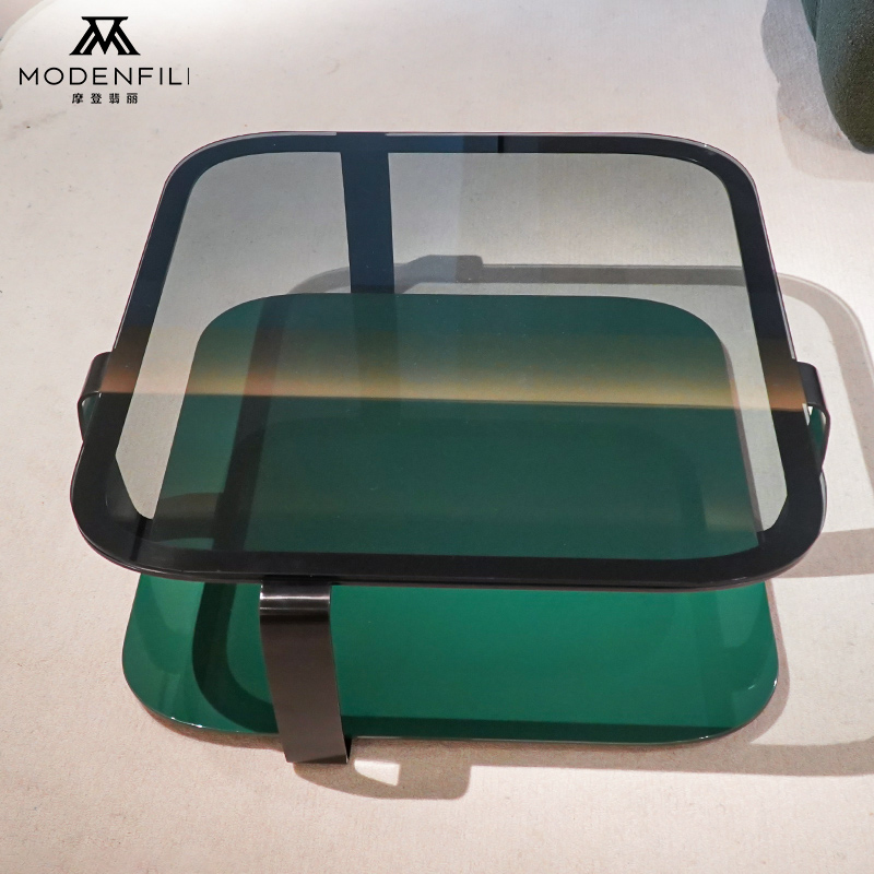 Inject a vibrant touch into your living space with the MODENFILI V2216H2 contemporary glass coffee table. This distinctive table features a clear glass top that allows the striking green base to stand out, creating a bold visual statement. The combination of transparent and colored glass adds a playful yet sophisticated element to your decor. Ideal for modern interiors, the V2216H2 offers a functional and stylish surface for your living room needs. Whether you're entertaining guests or enjoying a quiet evening, this coffee table provides a unique and eye-catching focal point. Discover the perfect blend of form and function with the MODENFILI V2216H2 glass coffee table.