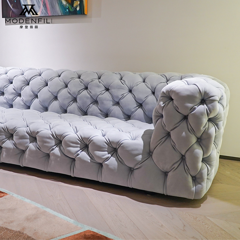 Transform your living space with the MODENFILI V2220SF4 luxurious tufted chaise lounge, designed to offer unparalleled comfort and style. This chaise lounge features a plush, tufted upholstery in a soothing light blue shade that adds a touch of elegance and tranquility to any room. The V2220SF4 model is crafted with a modern design that includes ample seating and soft, supportive cushions, making it perfect for lounging, reading, or simply relaxing at home. Its spacious design and sophisticated look make it an ideal centerpiece for contemporary living areas. Experience the perfect blend of luxury and comfort with the MODENFILI V2220SF4 chaise lounge, where modern design meets everyday relaxation.
