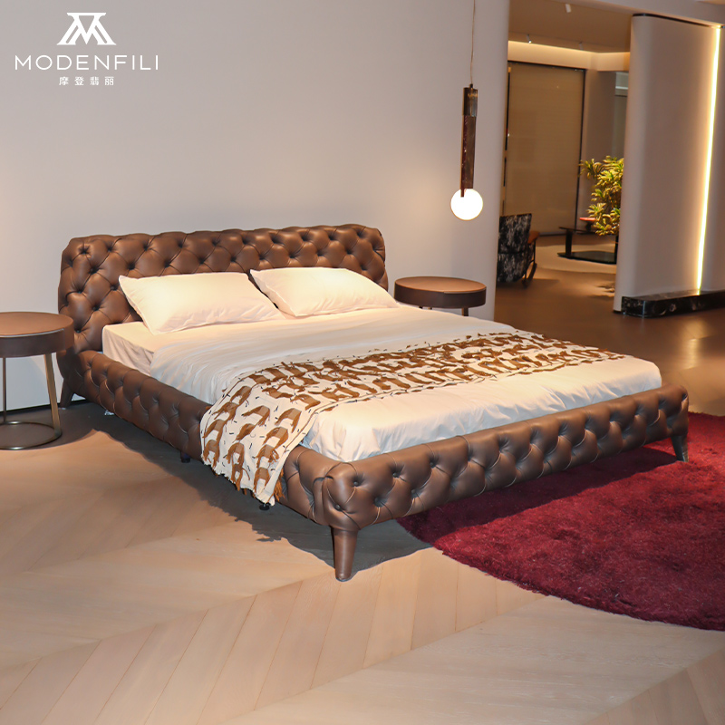 The MODENFILI V2208B1 bed is a luxurious piece of furniture that exudes modern elegance and comfort. This bed features a sumptuous tufted leather design that adds a touch of sophistication to any bedroom. The high headboard, adorned with button tufting, not only serves as a striking visual element but also provides a comfortable backrest for reading or watching TV. The V2208B1 is crafted with premium materials, ensuring durability and a luxurious feel that enhances the quality of your sleep. The bed's frame is robust, with a low-profile footboard that complements the overall design, while the dark wood legs add a classic touch to the contemporary style. This bed is more than just a place to sleep; it's a statement piece that transforms your bedroom into a haven of relaxation. The V2208B1 is designed for those who appreciate the finer things in life and desire a bedroom that reflects their personal style. Its combination of comfort, style, and functionality makes it an essential piece of furniture for any home. Whether you're looking to create a luxurious retreat or simply upgrade your sleeping space, the MODENFILI V2208B1 bed offers a luxurious sleeping experience that is both stylish and restful.