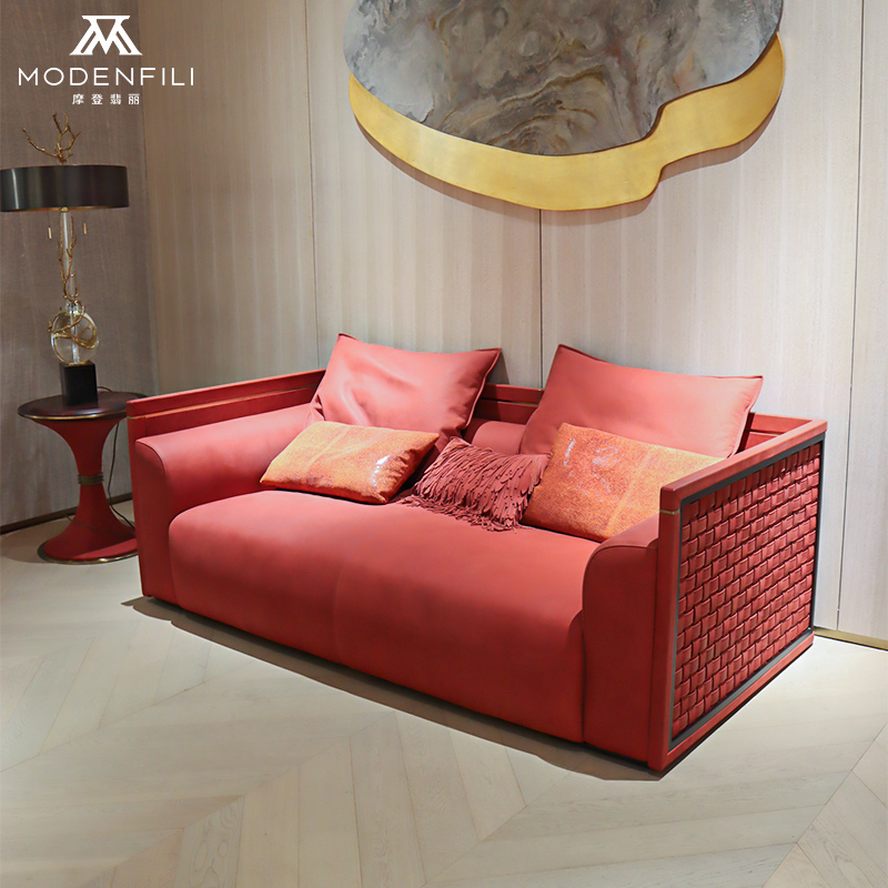 The MODENFILI SM010 sofa is a striking piece of furniture that brings a vibrant splash of color and a sense of modern luxury to any living space. This bold red leather sofa features a rich, deep hue that commands attention and a smooth, supple texture that invites touch. The SM010 is designed with a sleek, contemporary silhouette that complements a variety of interior styles, from minimalist to eclectic. Its plush cushions and comfortable seating area provide the perfect spot for relaxation and conversation, making it an ideal centerpiece for your living room. The sofa's sturdy frame, crafted from high-quality materials, ensures durability and stability, while the luxurious leather upholstery adds a touch of opulence to the overall design. This sofa is not just a place to sit; it's a statement piece that reflects your personal style and elevates the ambiance of your home. Whether you're looking to create a cozy den or an upscale lounge, the MODENFILI SM010 sofa offers both comfort and style, making it an essential addition to any discerning homeowner's collection. Its combination of comfort, style, and functionality makes it a sophisticated choice for those who appreciate fine craftsmanship and wish to create a warm, inviting atmosphere in their living space.