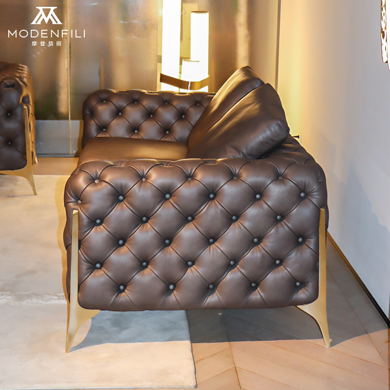 The MODENFILI V2208 loveseat is a perfect blend of classic elegance and modern comfort, designed to be the focal point of any living room. This brown leather loveseat features a rich, warm hue that adds a touch of sophistication to your decor, while its plush cushions provide the ultimate in relaxation. The V2208 is crafted with a timeless tufted design that adds depth and texture to the piece, making it a statement of style and comfort. The loveseat's sturdy frame is built to last, ensuring durability and stability, while the high-quality leather upholstery adds a touch of luxury to the overall design. This loveseat is not just a piece of furniture; it's a statement piece that reflects your refined taste and appreciation for quality craftsmanship. Whether you're looking to create a cozy reading nook or a stylish seating area in your living room, the MODENFILI V2208 loveseat offers a comfortable and inviting experience that is both stylish and restful. Its combination of comfort, style, and functionality makes it an essential piece for any home aspiring to achieve a high-end, contemporary look. The V2208 is designed for those who value both form and function in their furniture choices, offering a sophisticated and modern look that elevates any room. Whether you're hosting a social gathering or enjoying a quiet evening at home, this loveseat provides both style and utility, making it an essential addition to any discerning homeowner's collection.