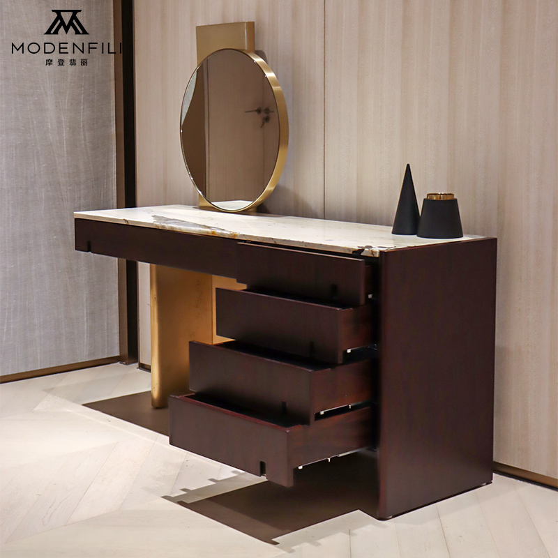 The MODENFILI SM007-2 vanity table is a stunning piece of furniture that brings a sense of modern elegance and luxury to your bedroom or dressing area. This vanity table features a sleek design with a marble countertop that adds a touch of sophistication to your decor, while its dark wood base provides a solid and stylish foundation. The table's reflective round mirror not only serves a practical purpose but also enhances the room's aesthetics by creating an illusion of more space. The SM007-2 is designed with functionality in mind, offering ample storage with its drawers for keeping cosmetics, jewelry, and other personal items neatly organized. The gold accents on the legs and handles add a luxurious flair that pairs beautifully with both contemporary and classic interior styles. This vanity table is more than just a place to get ready; it's a statement piece that reflects your refined taste and appreciation for high-quality craftsmanship. Whether you're looking to create a spa-like retreat in your home or simply want to upgrade your dressing area, the MODENFILI SM007-2 vanity table offers both style and utility, making it an essential addition to any home that values comfort and elegance. The SM007-2 is designed for those who seek to combine form and function in their furniture choices, offering a sophisticated and modern look that elevates any space.