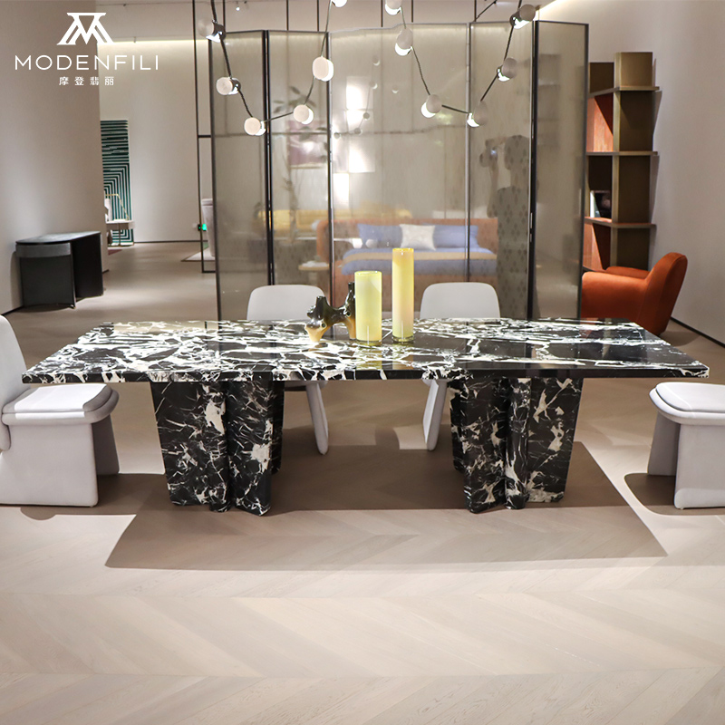 The MODENFILI V2233D2 dining table is a masterpiece of modern design that serves as the focal point in any contemporary dining space. This black and white marble table features a striking contrast that adds a touch of sophistication and warmth to your decor, while its plush cushions provide the ultimate in comfort for dining and conversation. The V2233D2 is crafted with a sleek silhouette that complements minimalist and modern interiors, showcasing clean lines and a minimalist aesthetic that is both stylish and timeless. The table's sturdy frame, made from high-quality materials, ensures durability and stability, while the soft fabric upholstery adds a touch of luxury to the overall design. This dining table is not just a place to eat; it's a statement piece that reflects your refined taste and appreciation for quality craftsmanship. Whether you're looking to create a cozy family dining area or a stylish seating arrangement in your kitchen, the MODENFILI V2233D2 table offers a comfortable and inviting experience that is both stylish and restful. Its combination of comfort, style, and functionality makes it an essential piece for any home aspiring to achieve a high-end, contemporary look. The V2233D2 is designed for those who value both form and function in their furniture choices, offering a sophisticated and modern look that elevates any room. Whether you're hosting a social gathering or enjoying a quiet dinner at home, this table provides both style and utility, making it an essential addition to any discerning homeowner's collection.