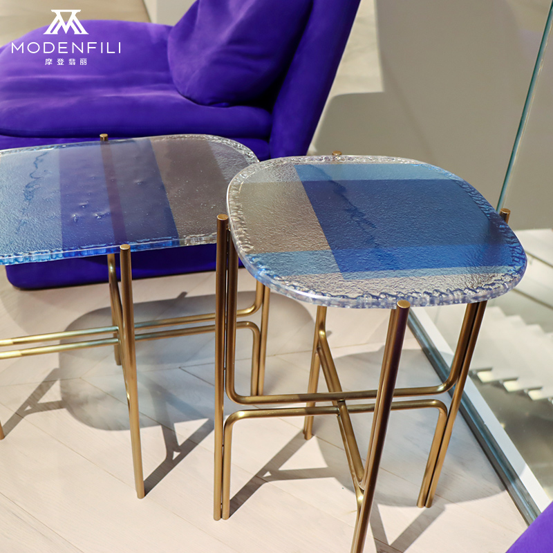 The MODENFILI V2215H6 is a set of modern glass side tables that brings a unique blend of contemporary design and functionality to any living space. These tables feature a striking combination of clear glass and bold blue stripes, adding a splash of color and a touch of sophistication to your decor. The glass surfaces are not only visually appealing but also practical, making them easy to clean and maintain. The V2215H6 side tables are designed with sleek, gold-colored metal legs that provide a sturdy foundation and add an element of luxury to the overall design. The minimalist aesthetic of these tables makes them versatile pieces that can complement a variety of interior styles, from modern to eclectic. The tables' compact size makes them perfect for use in smaller spaces, such as next to a sofa or as an accent in a corner. Their functionality extends beyond mere decoration; they provide a convenient surface for placing drinks, snacks, or decorative items. The MODENFILI V2215H6 side tables are not just furniture; they are statement pieces that reflect your refined taste and appreciation for quality craftsmanship. Whether you're looking to create a cozy reading nook or a stylish seating area in your living room, the V2215H6 tables offer a comfortable and inviting experience that is both stylish and restful. Their combination of comfort, style, and functionality makes them an essential piece for any home aspiring to achieve a high-end, contemporary look. The V2215H6 is designed for those who value both form and function in their furniture choices, offering a sophisticated and modern look that elevates any room. Whether you're hosting a social gathering or enjoying a quiet evening at home, these tables provide both style and utility, making them an essential addition to any discerning homeowner's collection.